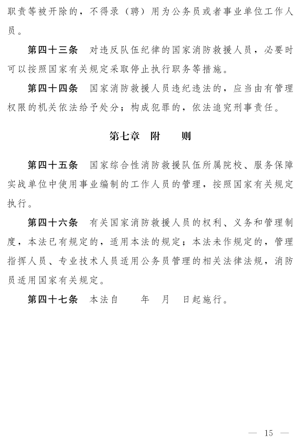 《中華人民共和國 消防救援人員法(草案)》已于2月27日公布,社會公眾可以直接登錄中國人大網(wǎng)或 法律法規(guī)數(shù)據(jù)庫提出意見,也可以將意見寄送全國人大常委會法制工作委員會(北京市西城區(qū)前門西大街1號,郵編:100805。信封上請注明 消防救援人員法草案征求意見)。